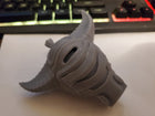 Her eyes are pitch black and lusterless, giving her a rather unsettling and disturbing gaze. When fully equipped for delving, she wears bulky armor and a disc-shaped hat that covers her eyes.